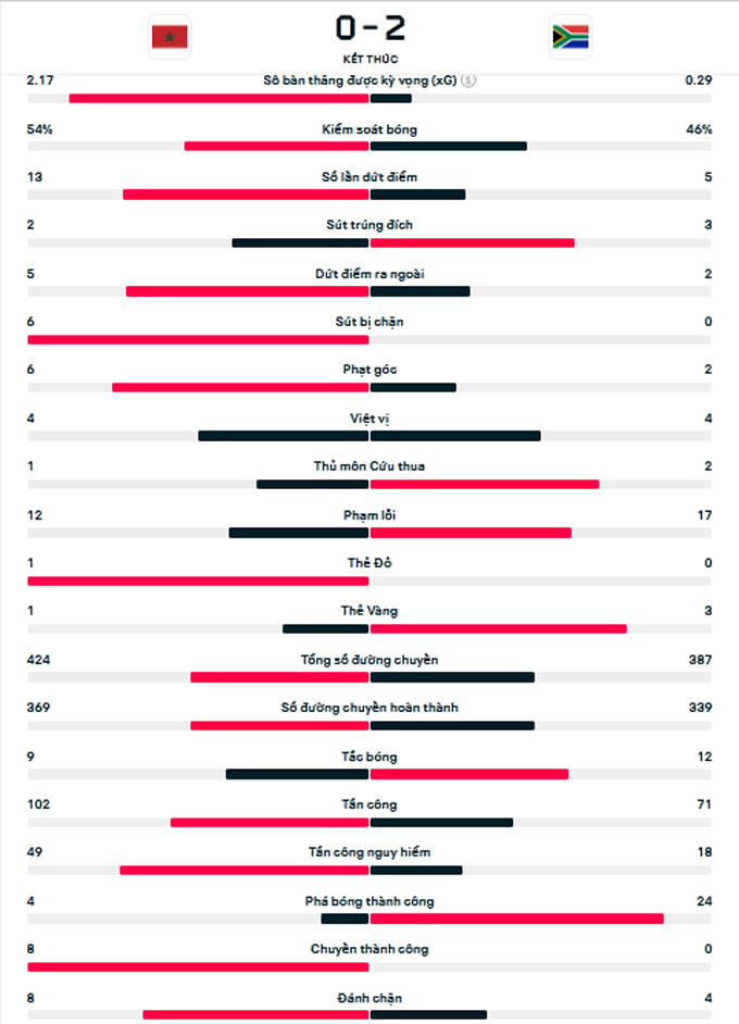 Dù được đánh giá cao hơn trước Nam Phi nhưng Morocco đã thi đấu không thành công khi để thua 0-2 và phải về nước trong cay đắng.