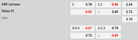 Sàn giao dịch châu Á ghi nhận mức kèo 0:0 thời điểm đầu, nhưng lúc này đã được đẩy lên thành AEK Larnaca chấp 1/4 trái, cho thấy các nhà đầu tư đang có niềm tin rất lớn vào đội chủ nhà. Đây là điều hoàn toàn dễ hiểu, bởi thực tế Pafos đâng thể hiện phong độ kém thuyết phục trên sân khách, khi không thắng kèo châu Á 4 trận xa nhà gần nhất với 3 thất bại và 1 trận hòa. Với AEK Larnaca, đội bóng này toàn thắng 5 trận sân nhà gần nhất.