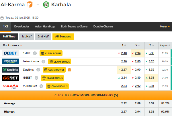 3 trong số 4 trận đấu vừa rồi giữa Al Karma có tỷ số xỉu 2. Karbalaa là một trong những đội bóng có hàng công yếu kém nhất giải với chỉ 9 bàn thắng sau 11 trận và khó có thể yêu cầu trận đấu của họ có nhiều bàn thắng.