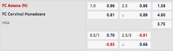 Dù có nhiều lợi thế hơn đối phương và được chơi ở sân nhà nhưng kèo chấp 1 hòa ăn cao ẩn chứa nhiều rủi ro với Astana. Nhìn sang tỷ lệ hiệp 1 họ chấp có 1/4 càng làm tăng độ nghi ngờ vào cửa trên. Nên nhớ Corvinul Hunedoara đã thắng kèo cả 2 trận sân khách vừa qua.