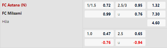 Kèo cả trận chấp 1 1/4 ăn ít và hiệp 1 chấp hòa cân tiền cho thấy cửa Astana sáng giá hơn. Dẫu sao thì đại diện của Kazakhstan cũng là cái tên có nhiều kinh nghiệm tham dự Cúp châu Âu và thời điểm hiện tại cũng đang duy trì phong độ ổn định.