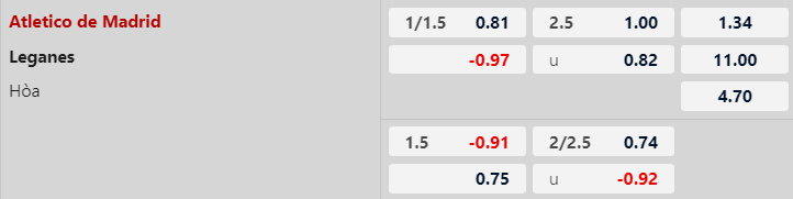 Atletico Madrid chấp Leganes 1 1/4 bàn cả trận. Atletico Madrid có nhiều cơ hội chiến thắng hơn trước một Leganes yếu hơn rất nhiều. Leganes đã thua ba lần và hòa 2 lần trong năm lần đối đầu gần nhất với Atletico Madrid, vì vậy đây sẽ là một cuộc chạm trán khó khăn tại Cívitas Metropolitano. Với đẳng cấp của mình, đội chủ nhà được dự đoán thắng từ cách biệt 2 bàn trở lên.