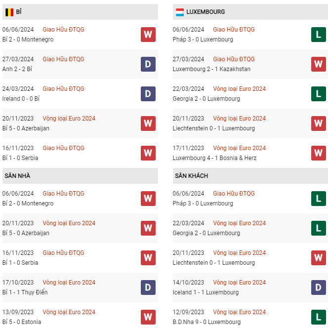 - Trận đối đầu gần nhất tiếp đón Luxembourg trên sân nhà, Bỉ thắng 5-1.