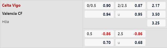 4 trên 5 cuộc đấu gần nhất giữa Celta Vigo và Valencia đều đã về kèo Tài chung cuộc với rất nhiều bàn thắng được ghi. 4 trận liền có sự góp mặt của Celta Vigo đều kết thúc với tối thiểu 3 pha lập công sau 90 phút. Kịch bản tương tự cũng xảy ra ở cả 3 trận đấu liên tiếp có sự xuất hiện của Bầy Dơi. Vậy nên, với tỷ lệ tài xỉu tương đối nhẹ nhàng 2 1/4, cơ hội để kèo đấu này tiếp tục về Tài là rất rõ ràng.