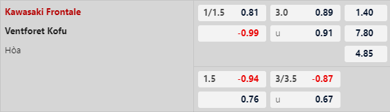 Giới chuyên gia đánh giá rất cao Kawasaki Frontale trong màn tiếp đón Ventforet Kofu với kèo chấp -1 1/4 theo handicap. Đây là điều hợp lý bởi ngoài sự chênh lệch về đẳng cấp giữa 2 giải đấu thì thành tích đối đầu đang ủng hộ Kawasaki Frontale. Cụ thể, đội bóng này đã thắng tới 7 trong tổng số 10 lần so tài giữa 2 đội và cả 7 trận thắng đó đều với tỷ số cách biệt từ 2 bàn trở lên.