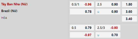 Không có gì phải bàn cãi khi Nữ Tây Ban Nha là đội được đánh giá cao hơn ở thời điểm hiện tại với kèo chấp -3/4 theo handicap. Thống kê đối đầu đang nghiêng về phía Nữ Brazil với 2 chiến thắng và 1 trận hòa sau 4 lần chạm mặt trong quá khứ. Tuy nhiên, với bối cảnh hiện tại, khả năng rất cao Nữ Tây Ban Nha sẽ dễ dàng hạ gục được đại diện Nam Mỹ.