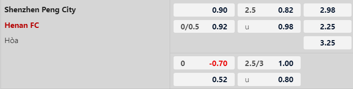 Được thi đấu trên sân nhà nhưng Shenzhen Peng City vẫn bị xếp cửa dưới với mức kèo được chấp +1/4. Mặc dù phong độ gần đây của Shenzhen Peng City đã khá tốt nhưng trên sân nhà đội bóng vẫn thua ở 4 trong 5 trận gần đây. Trong khi đó, Henan FC lại đang chơi tốt ở các trận gần đây và chỉ chịu thua trước đội đầu bảng Shanghai Port. Thế nên có lẽ đội khách vẫn sẽ giành chiến thắng ở trận đấu này.