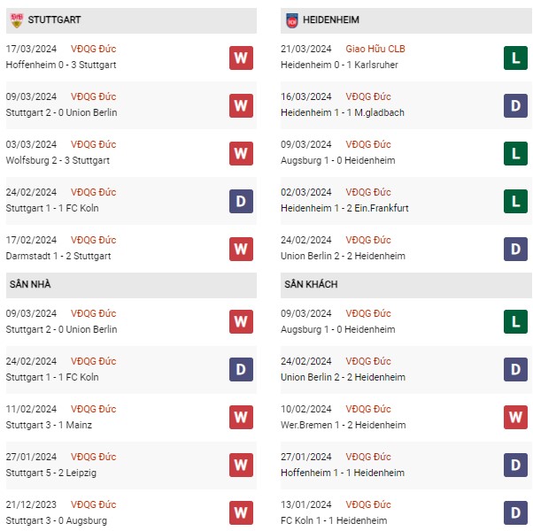 - Heidenheim thắng 3 thua 5 và hòa 2 trong 10 lần đối đầu gần nhất với Stuttgart.