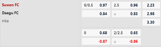 Nhà cái đưa ra mức cược Suwon FC -1/4 theo handicap. Suwon FC đang thuộc nhóm cạnh tranh ngôi vô địch. Trong khi đó, Daegu hiện thuộc nhóm đáy bảng. Điều đó thể hiện rõ phong độ khác biệt nhau của đôi bên. Bất chấp việc Suwon FC mới thắng Daegu 1/10 trận đối đầu gần nhất, nhưng trận này kèo trên vẫn là nơi đầu tư an toàn.