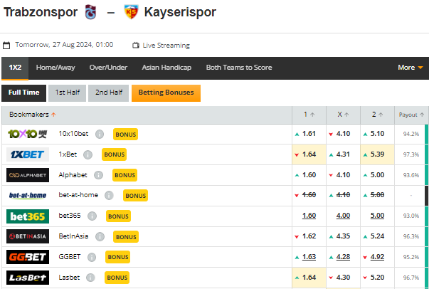 Trabzonspor hiện sở hữu thành tích đối đấu ấn tượng hơn so với Kayserispor. Theo thống kê qua 10 trận hai đội gặp nhau gần nhất, Trabzonspor thắng 5 trận đấu. Ngược lại, Kayserispor chỉ có 3 thắng lợi còn lại cùng 2 trận hòa. Lần gặp nhau gần nhất của đôi bên, Trabzonspor thắng Kayserispor 3-1 ngay trên sân khách. 3 trận đấu gần nhất trên sân nhà, Trabzonspor toàn thắng. Ngược lại, Kayserispor thua 4/5 trận gần nhất. Rõ ràng, đội chủ nhà hoàn toàn tự tin hướng đến thắng lợi thuyết phục nhất trước các vị khách.