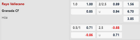 Vallecano là đội cửa trên trong trận đấu này, họ chấp 1 hòa theo handicap. Rayo Vallecano sẽ có tinh thần cao khi chỉ phải tiếp đón Granada đã xuống hạng. Đội khách không mang lại nhiều sự đảm bảo khi bước vào trận đấu này sau chuỗi 2 trận thua và không thắng trong 10 lần đụng độ đối đầu trước Vallecano vừa qua. Mặc dù Rayo Vallecano đang có phong độ yếu nhưng họ nhiều khả năng sẽ giành chiến thắng.